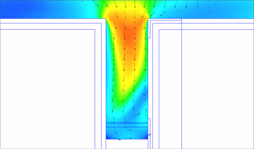 Les résultats des simulations mettent en évidence des phénomènes particuliers. Au rez-de-chaussée par exemple, les couloirs orientés parallèlement au vent créent des zones de survitesses. Ce phénomène est dû à la réduction de la section de passage l’air qui induit une accélération du flux : l’effet Venturi. Dans ces zones spécifiques, l’inconfort peut être plus marqué.