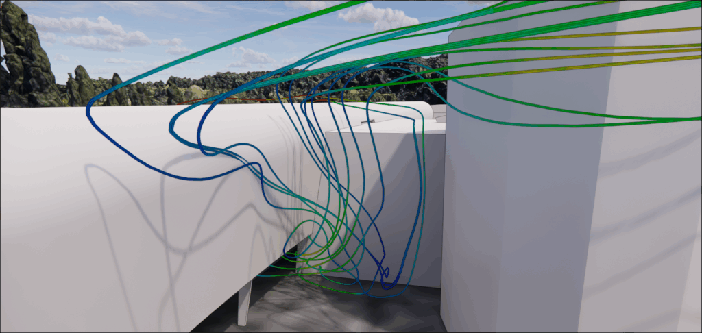 Ces effets, bien que localisés, influencent directement le confort des usagers dans les zones de circulation extérieures. Les simulations CFD réalisées par EOLIOS permettent d’identifier précisément ces zones d’accélération, afin d’en tenir compte dans les aménagements futurs.