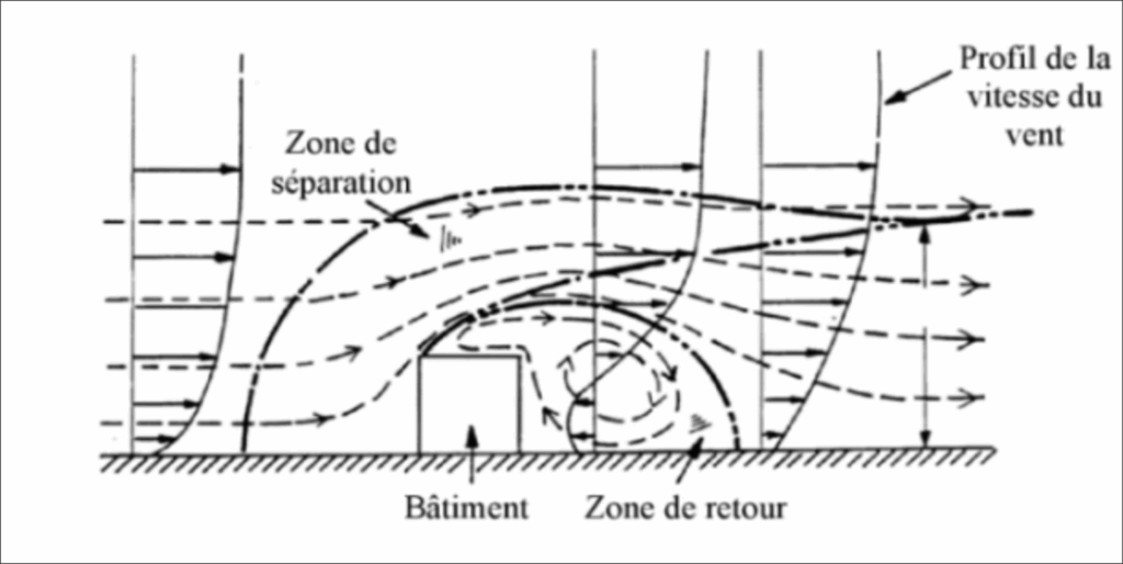 Usuellement, lorsque le vent vient heurter un bâtiment, trois zones principales de perturbation apparaissent. À l’avant, un vortex turbulent dû à l’écoulement descendant sur la face au vent. À l’arrière du bâtiment, une zone de turbulence s’étire dans la cavité de basse pression due à la séparation des écoulements au niveau des bords du bâtiment. Plus loin, le sillage du bâtiment est caractérisé par une turbulence élevée et des vitesses horizontales inférieures opposées à celles de l’écoulement non perturbé.