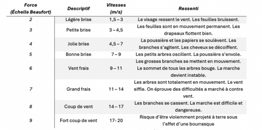Toutes ces notions sont cependant pondérées par l’état subjectif de l’individu, et sa sensation de confort ou d’inconfort dépend très largement de facteurs liés à son activité (niveau métabolique) ainsi qu’au climat ou à la saison (état thermique de l’ambiance). Malgré la subjectivité du ressenti, l’échelle de Beaufort fournit une caractérisation qualitative utile du confort et des effets perceptibles du vent sur les usagers.
