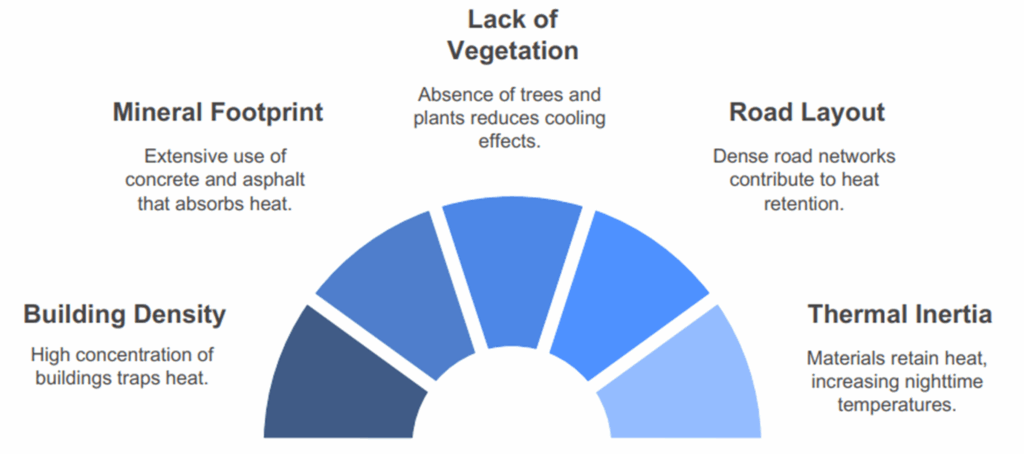 Les îlots de chaleur urbains sont le résultat d’une combinaison de facteurs structurels et environnementaux liés à l’aménagement des villes. Il naît d’une densité bâtie élevée qui limite la ventilation naturelle, d’une forte emprise minérale au sol avec des matériaux comme le bitume ou le béton qui emmagasinent la chaleur, et d’un manque de végétation ou de surfaces rafraîchissantes comme les plans d’eau. La configuration des voiries, les matériaux à faible albédo et à forte inertie thermique, ainsi que l’orientation des bâtiments, contribuent à piéger la chaleur dans le tissu urbain, particulièrement la nuit où les températures restent anormalement élevées par rapport aux zones rurales voisines.